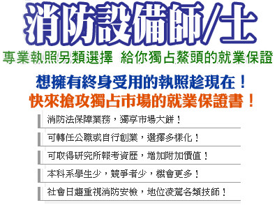 消防設備師/士執照考試,只要年滿20歲、專科以上畢業皆可報考,及早報名及早準備,目前僅警校體系及吳鳳技術學院有消防科系的畢業生,競爭對手少。