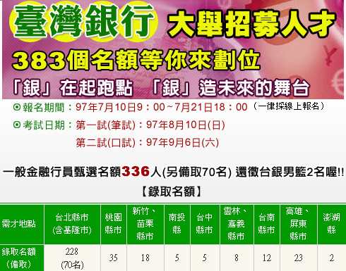 台灣銀行97年新進人員甄試正式展開囉,一共甄試383名,而且還收台銀籃球隊2名喔!!